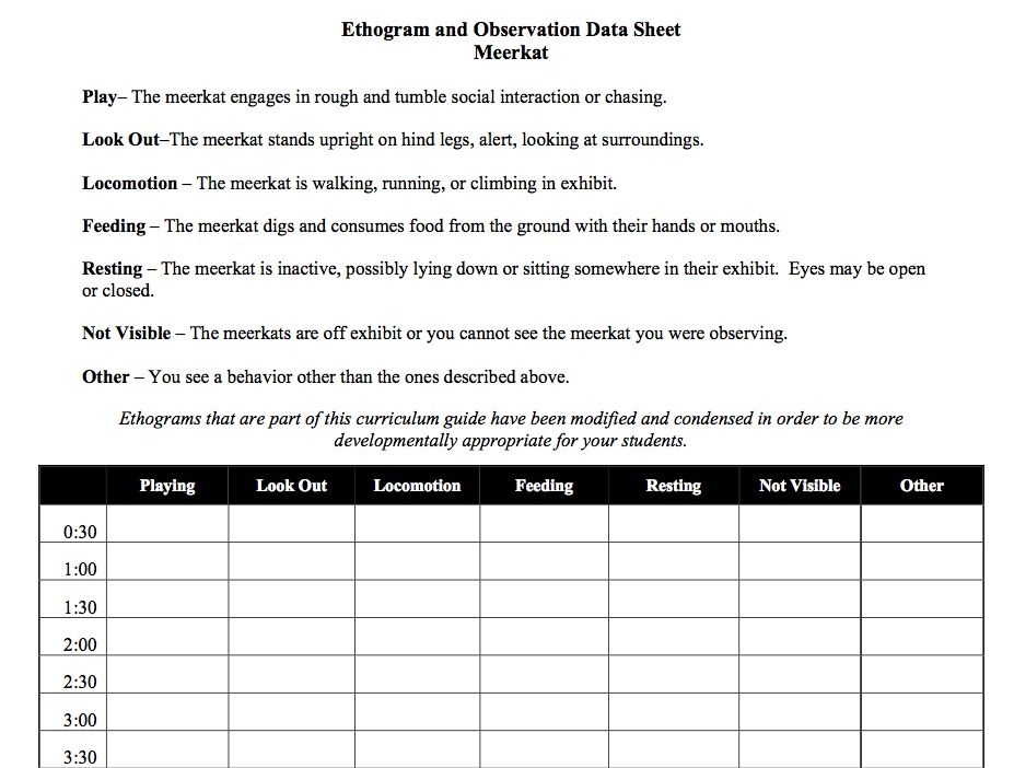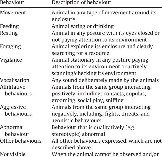 An ethogram typically includes a list of all the behaviors an animal is capable of performing, and the frequency and duration of each behavior. This can include behaviors such as eating, drinking, grooming, sleeping, socializing, and interacting with their environment. Observers will record the time of day, location, and context of the behavior, as well as any other relevant information.
